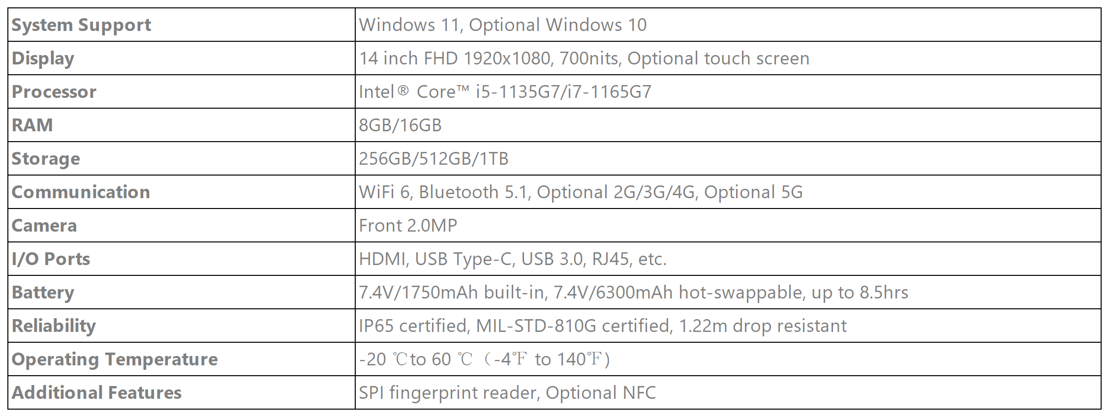 The SE-14LI rugged laptop is built to thrive in harsh environments, fearless with its standard IP65-rated water and dust resistance, and MIL-STD-810G certification for robustness, ensuring safety from falls up to 1.22 meters. It’s designed to operate steadily in extreme challenges, from pouring rain to sandstorms, maintaining performance in temperatures ranging from -20°C to +60°C (4°F to 140°F), ensuring stability and durability under stringent conditions.