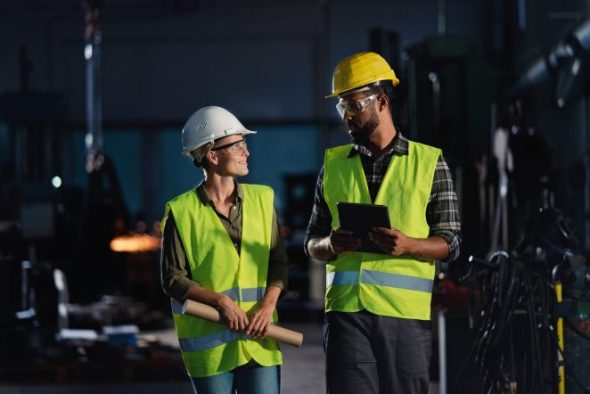 Industrial inspectors with rugged tablet doing a general check up
